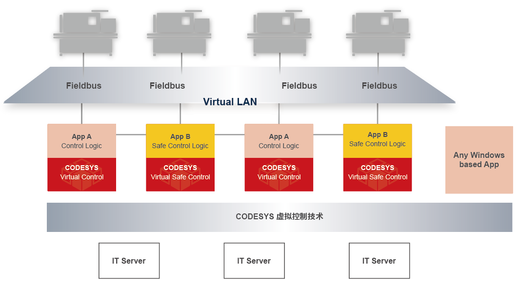 CODESYS 虚拟控制解决方案根据客户在稳定性和实时性等方面的需求,既可以在传统控制器(PLC)中部署运行,也可以在边缘计算单元、私有云或公有云服务器中部署运行,实践了“硬件平台提供算力资源,软件系统定义智能算法”的理念。